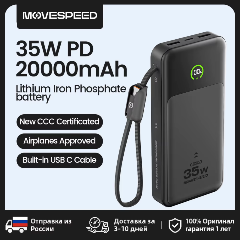 🔸 Внешний аккумулятор MOVESPEED MSP20 с встроенным кабелем Type-C, 20000мАч, 35W (сертификация CCC) за - 1 298 ₽ с купоном продавца 161 ₽ от 162 ₽ (взять можно под ценой)