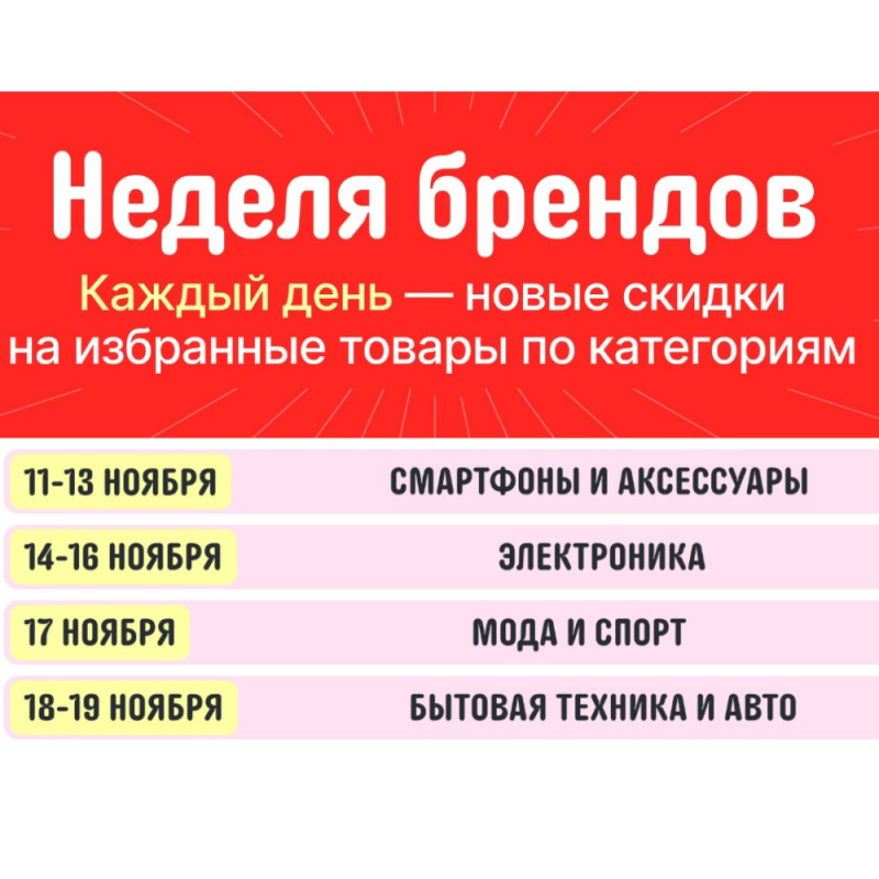 🔸 Во время распродажи 11.11 на Алиэкспресс пройдет акция Неделя брендов — каждые день-два дня новые скидки на избранные товары по категориям ► s.uberdeal.ru/bcoP?erid=2SDnjd...