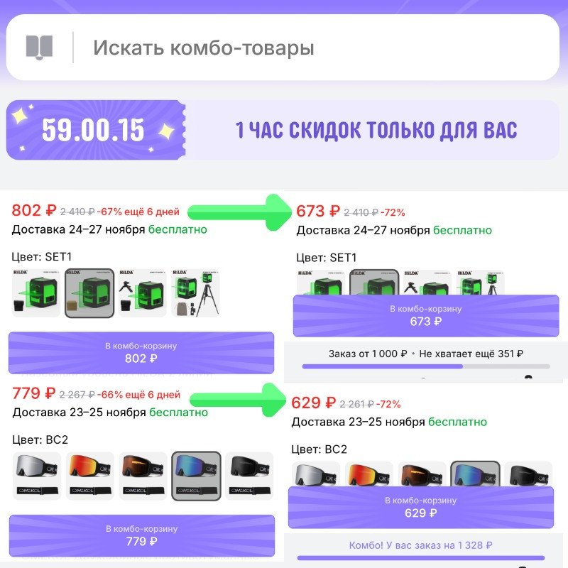 ▪️ специальный час персональных скидок на товары из раздела Комбо. Активируется при входе в приложение и действует только в первый час после входа в приложение (сразу после Часа выгоды с 12:01 по 10:00 следующего дня)