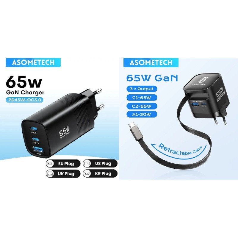 🔸 Зарядное устройство ASOMETECH 65W GaN с выдвижным кабелем Type-C 65Вт (Type-C + USB), черное за - 1 209 ₽ . Цена указана при покупке через «Комбо» корзину ► s.uberdeal.ru/bgC0?erid=2SDnjc...