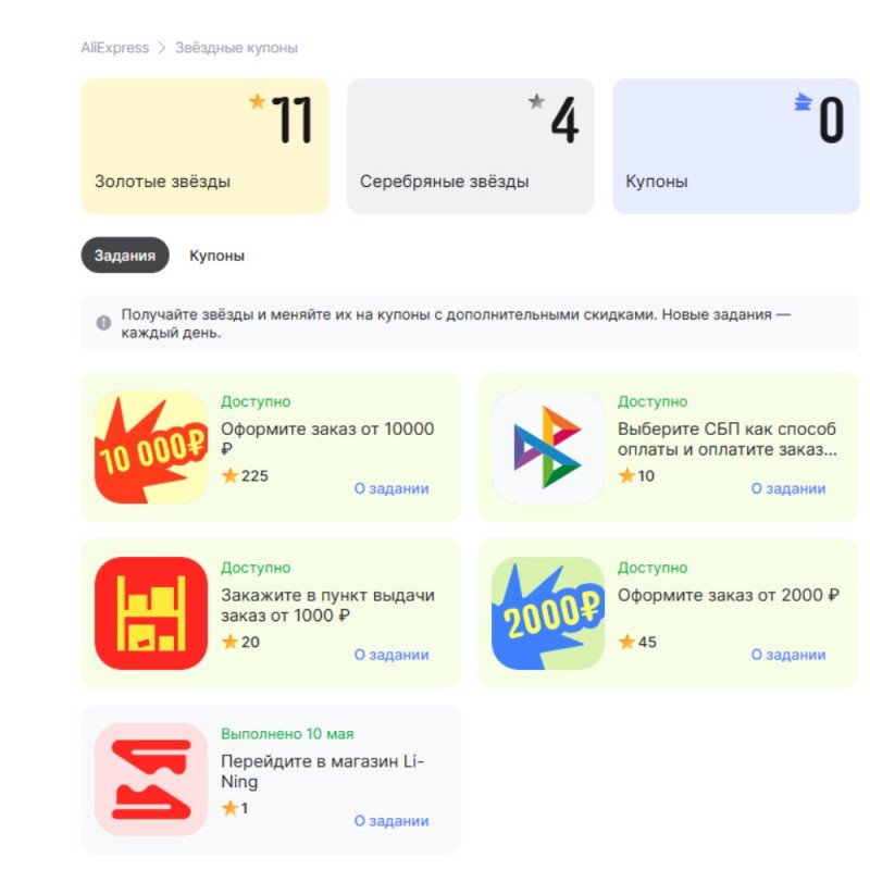 🔸 В рамках акции можно обменять звезды на купоны продавцов AliExpress, которые будут применяться на любые товары.