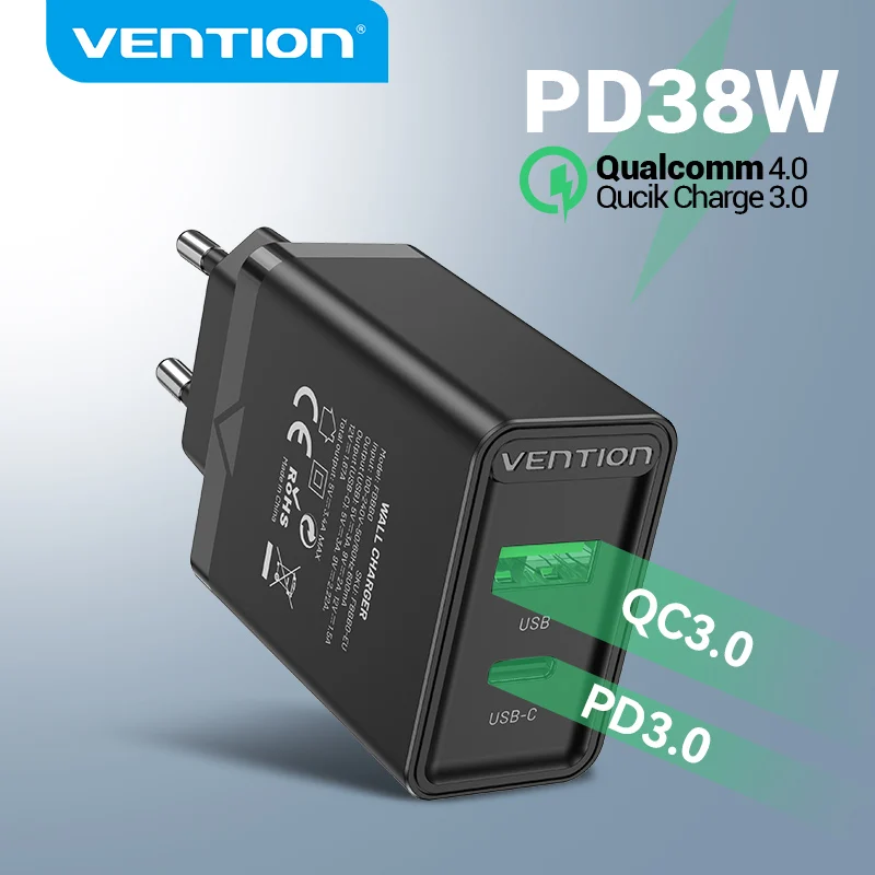 🔸 Зарядное устройство Vention 38W (USB QC 18W + Type-C PD 20W), черное, белое за - 651 ₽